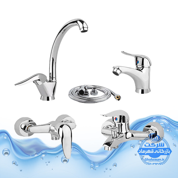ست ۵ عددی شیرآلات برند آیدا صنعت مدل دنیز | شیر روشویی اهرمی + شیر ظرفشویی + شیر حمام + شیر توالت + شلنگ توالت | کروم براق