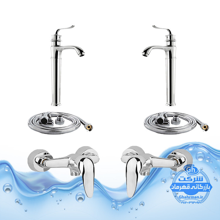ست ۶ عددی شیرآلات مدل دنیز | ۲ عدد شیر روشویی پایهبلند بامبو + ۲ عدد شیر توالت + ۲ عدد شلنگ توالت | کروم براق