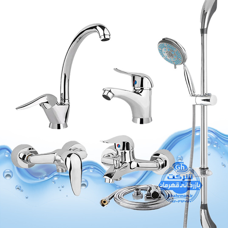 ست ۶ عددی شیرآلات برند آیدا صنعت مدل دنیز | شیر ظرفشویی + روشویی + حمام + توالت + علم دوش یونیکا + شلنگ توالت | کروم براق