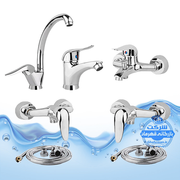 ست ۷ عددی شیرآلات برند آیدا صنعت مدل دنیز | ظرفشویی + روشویی + حمام + ۲ عدد توالت + ۲ عدد شلنگ توالت | کروم براق