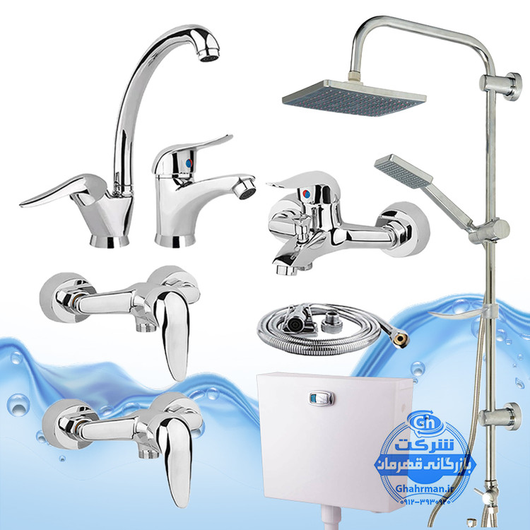ست ۷ عددی شیرآلات برند آیدا صنعت مدل دنیز | شیر ظرفشویی + روشویی + حمام + ۲ عدد توالت + علم دوش رسوبگیر اتومات + شلنگ توالت | کروم براق